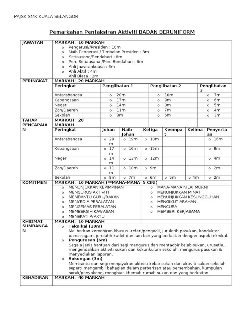 Kegiatan Kokurikulum Sekolah merangkumi tiga aktiviti utama iaitu KelabPersatuan Pasukan Badan Beruniform dan SukanPermainan. 19 Lampiran A DOKUMEN PENTAKSIRAN SEGAK DAN BMI 20 BORANG REKOD SEGAK MAKLUMAT DIISI OLEH GURU MATA PELAJARAN PENDIDIKAN. Manakala untuk pengisian secara manual boleh dilakukan dengan menggunakan Buku PAJSK yang ada dijual di pasaran.